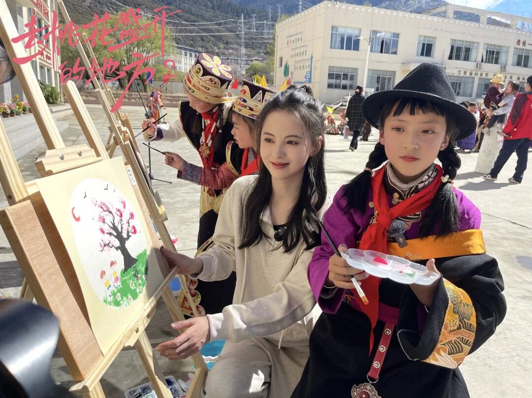 整个活动热烈且温馨,同唱一首歌、共绘一幅画、齐跳一支舞,剧组人员与林芝镇小学学生温暖互动,留下了非常多美好瞬间。尤其演与小朋友们同笔共绘的“桃花树下的幸福生活”图画,是雪域高原在党的关怀和温暖下幸福生活的最美写照,也将做为本剧海报之一,将孩子们心中的新时代、新西藏、新生活传遍世界,成为“创造更加幸福美好生活”的最好表达。