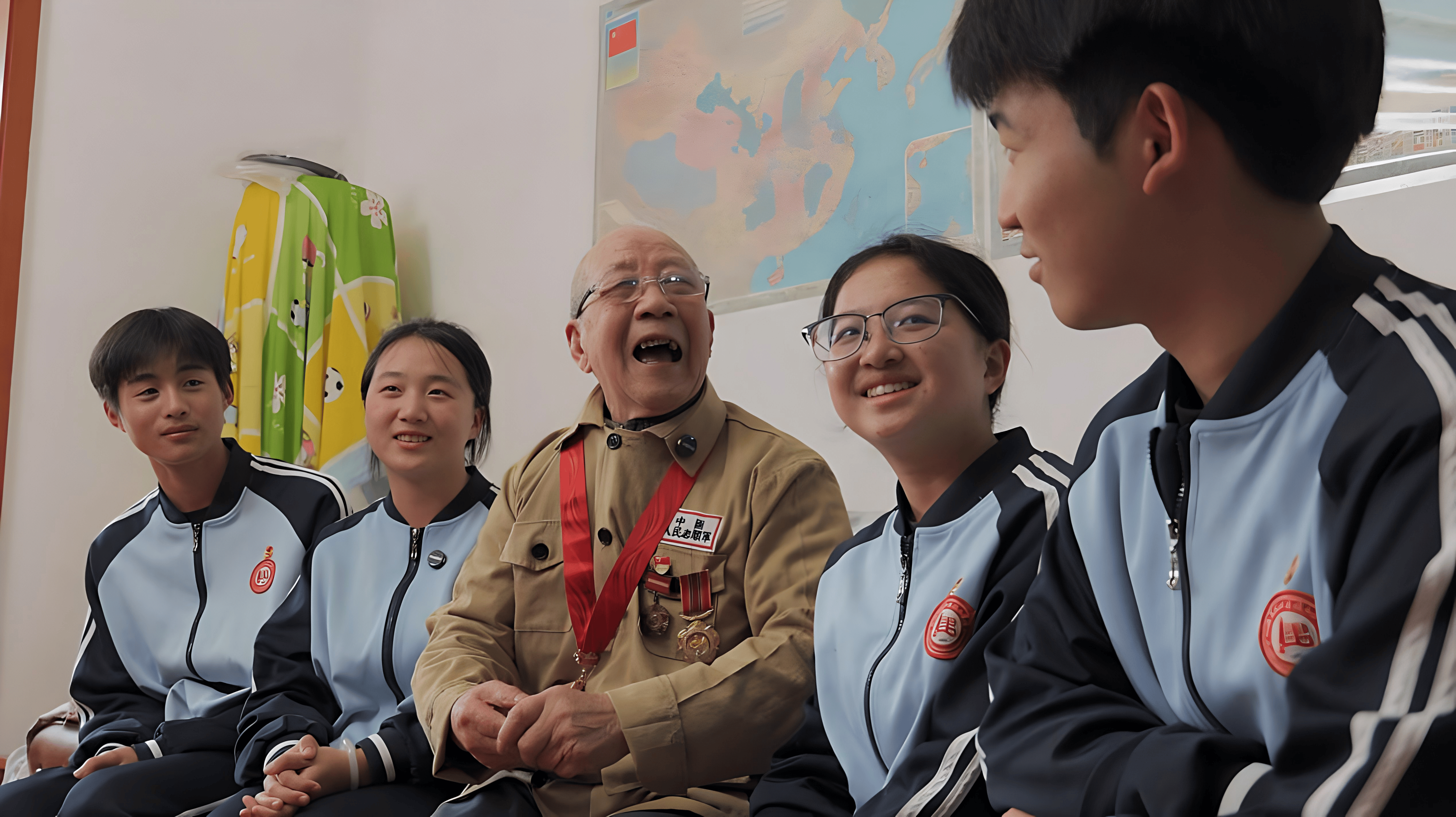 孩子们围坐在老兵身旁,轻声细语、满怀崇敬地提问: